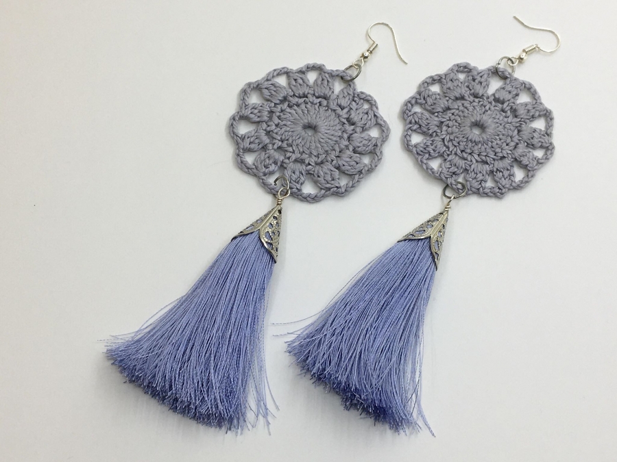 Materiāli: mākslīgais zīds, kokvilna, metāla āķīši. Sazinieties, ja vēlaties auskarus ar sudraba āķīšiem!